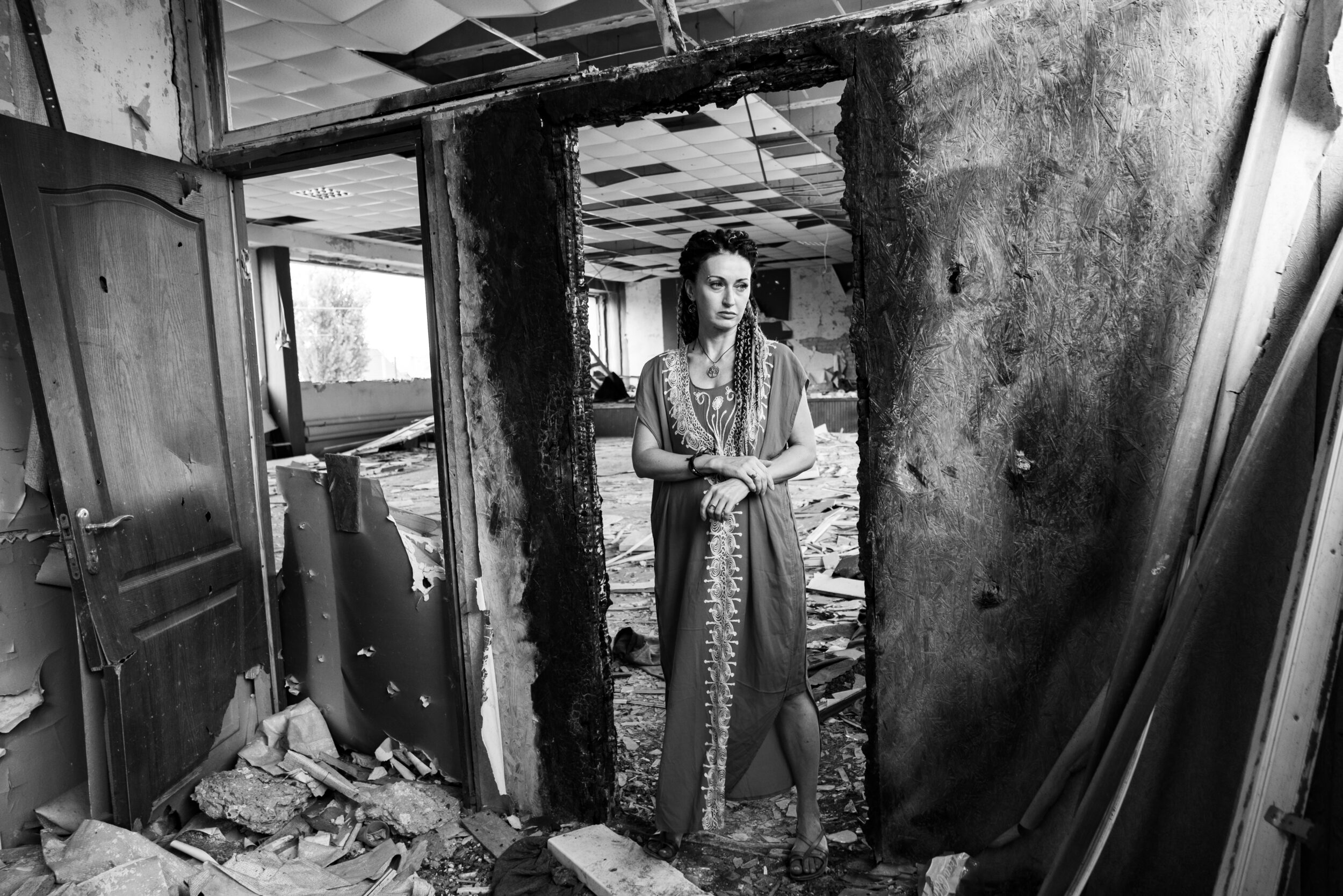 © Iva Sidash – Aliona in the ruined school where she once taught art. Slatyne, Kharkiv region, August 2024.
